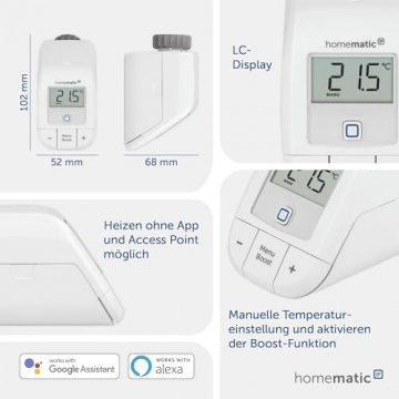 - Die Einrichtung und Steuerung der Thermostate über die kostenlose Smartphone-App und dem gebührenfreien Cloud-Service erfordert die Anbindung an den Homematic IP Access Point.
