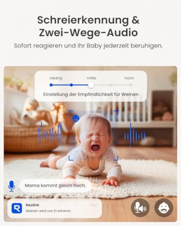 - Sofortige Schreierkennung & 2-Wege-Audio: Erhalten Sie sofort eine Benachrichtigung, wenn Ihr Baby od. Kid weint, und beruhigen Sie es direkt übers integrierte Mikrofon – für ein sicheres Gefühl, auch wenn Sie nicht vor Ort sind.